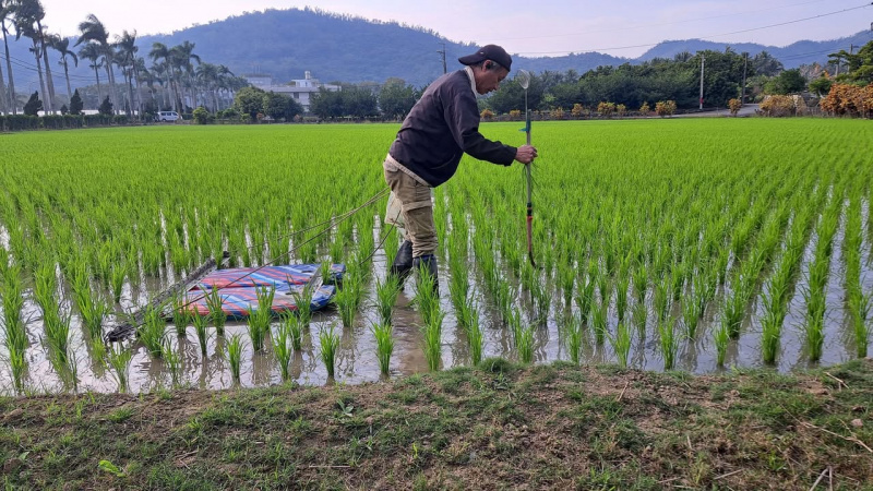 圖-第⼀次看到拿衝浪板除草,另⼀⼿持雙頭棒,⼀頭撈螺、⼀頭除長草(黃盟⽣FB)
