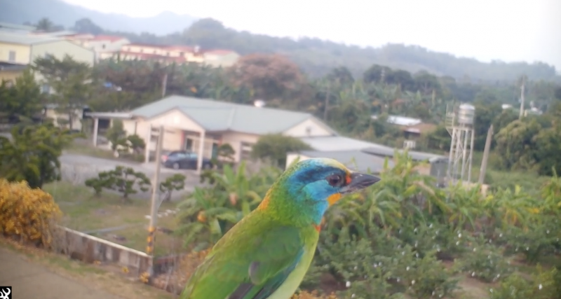 圖-停留在黃盟生田區的棲架上的五⾊⿃(黃盟⽣的YouTube「搖滾⽔稻農場」)